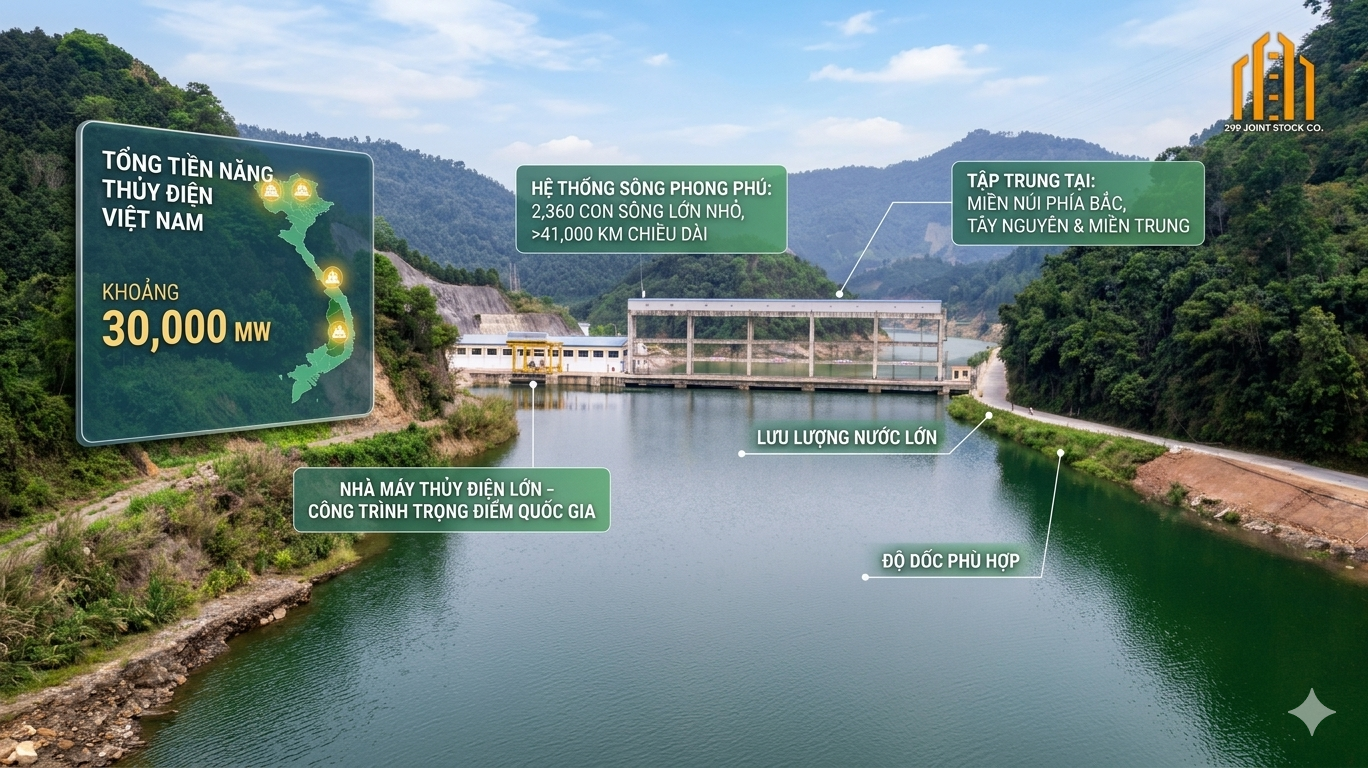 Theo các nghiên cứu quy hoạch năng lượng, tổng tiềm năng thủy điện Việt Nam có thể khai thác lên tới khoảng 30.000 MW. Phần lớn tiềm năng này tập trung tại khu vực miền núi phía Bắc, Tây Nguyên và miền Trung – nơi có địa hình đồi núi cao và hệ thống sông suối phong phú.